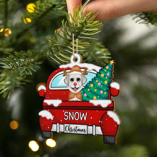 Chirstmas Dog Cat With Red Truck - Personalized Wooden Cutout Ornament 687346